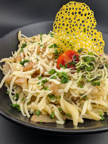 Vegetarische Krautnudelpfanne mit geriebenem Gouda